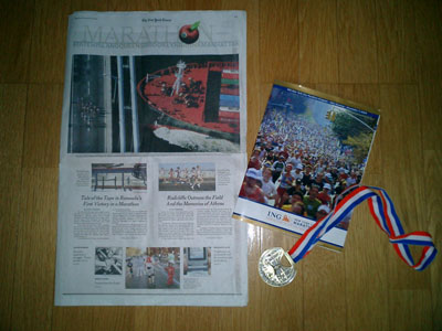 みんなありがとう!感謝します。 NYCマラソンの抽選に幸運にも当選して4回目のニューヨークシティマラソンを走ることができた。 タイムは思っていたものではなかったけれど、支えてくれた多くのボランティアの人たち、励ましの言葉をかけてくれた沿道のひとたち、世界中から集まったランナーたちに支えられての完走だった。 人種の違いや言葉の違い、宗教の違いを乗り越えて、26.2マイル(42..195キロ)を走りにニューヨークの街にやってきたランナーたちみんなが、世界の平和を願っていると思いたい。 翌朝のニューヨークタイムズのトップは、アメリカ軍がファルージャ病院を占拠し医者が後手でロープで縛られている写真が載っている。そしてマラソン特集ページには、スタテン島にかからベラザノなローズブリッジを走るトップランナーと橋の下を通過しようとしている船のコントラストが美しい写真だ。 戦争と100カ国からランナーが集まるNYCマラソン。なんという対比なんだろうと思った。 ランナーの中には、夫がファルージャに行っているという女性もいたようだ。 ニューヨークタイムズに載っていたあるランナーの言った言葉。 Sure, everything hurts. But that's just part of the marathon's charm. 本当にマラソン走った後は、もうだめーっていうほどつらいけど、そんな風になるのもまたマラソンの魅力の一つなのかもしれない。 でも、マラソンでなら、こんな風に思えるけれど・・・・。