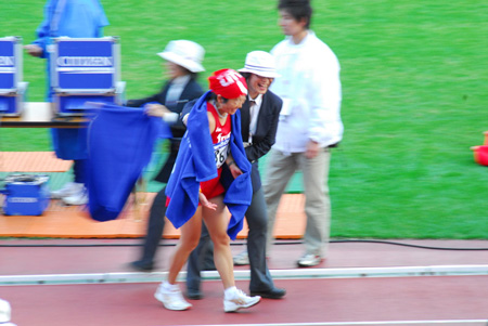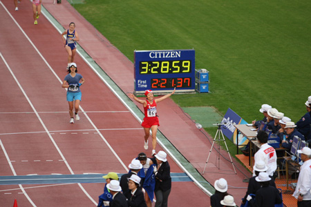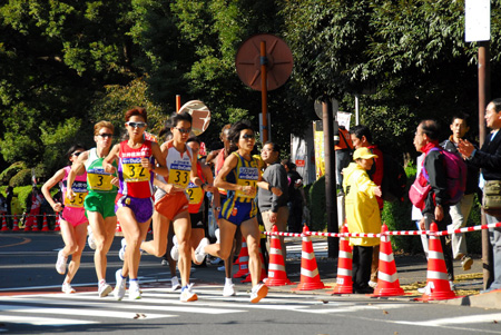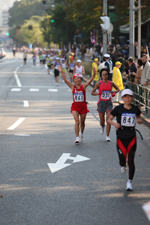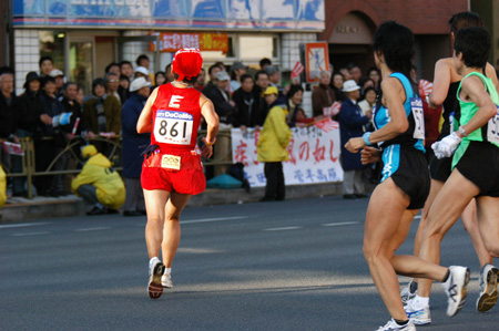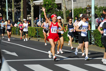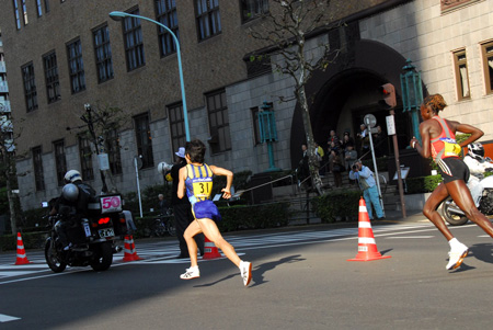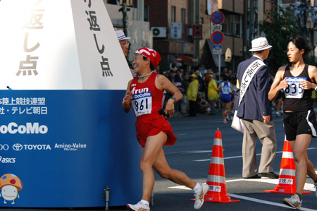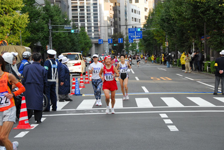 最後のコーナーを曲がったところで、女子の優勝の野口みずきさんが表彰されるところだった。思わず拍手をしてしまう。