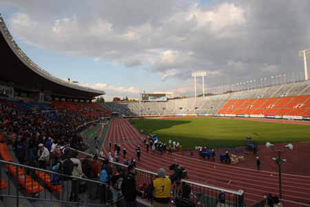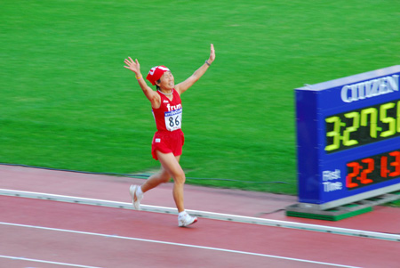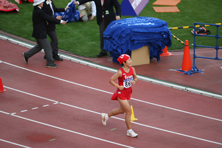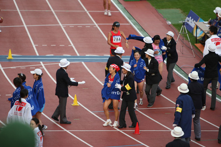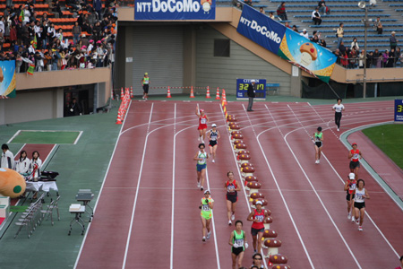 スタート位置のすぐ後ろには、長谷川理恵さん。そしてその後ろにはそんなに大勢の人はいない。持ちタイムは4分速くなったけれど、今年の番号は去年よりも50番後ろ側。号砲がなって、トラックを2周と3/4周(1100m)。スタンドの声援を受けながら今年も行ってきます!頑張ります!と気持ちをこめて手を振った。