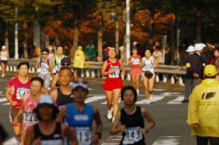 ただ気になることが一つ。向かい風が思いのほか強い。折り返してから向かい風になるのかなと予想していたのに前半から向かい風。長沼の向かい風に比べれば「ひどい」というほどではないけれど、このペースを維持するのに向かい風はちっと厳しい。横に並んだランナーの息遣いにびっくりする。私は、楽チンペース。折り返したら風向きが変わるはず。それまでは我慢、我慢。