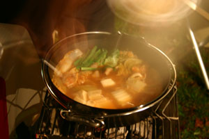 到着した時点の気温は4度。やはり他には誰もいない。いつもの場所がちょっと雰囲気が変わったな〜と思いながら、設営完了。寒いので中から暖めようと豚キムチ鍋。