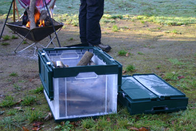 あくる朝、目が覚めるとさすがに空気が冷たい。外に出るとテントはバリバリ。マイナス1度。朝から焚火で暖を取る。焚火なしではこれからの季節、つらいだろうな〜。薪を家から持参するための折りたたみ式コンテナケースを購入。これは、なかなか具合が良い。ケースも霜で白くなっている。