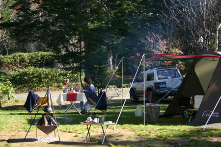 この後kenjiは昼寝。私はしばし周辺をランニング。こんな気持ちのよい天気のときは、いくらでも走っていられるような気持ちになる。近くの野鳥の森の探索路を制覇。次に反対側の模範牧場まで行ってみる。と、お昼になってしまった。目を覚ましていたkenjiはお道具の手入れに余念がない。暖かいそうめんでお昼を済ませて、撤収。