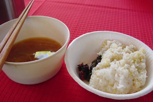 Uさんの奥様が、風呂敷片手にやってきた。なんとその中はご飯のお鍋。お鍋を新聞紙に包んでさらにキルティング生地で包んで風呂敷で仕上げ。こうすると冷めなくていいそうだ。中身は、五穀米のご飯。それに自家製味噌の味噌汁。なんとありがたい朝ごはん。おいしくいただきました。