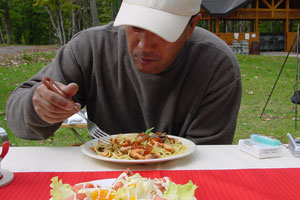 空気が澄んで気持ちのよい空の下、お昼はパスタ。