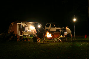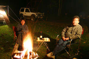 いつものように、暗い中でテントを設営して、さて晩御飯の準備でもするか〜という時に、1台の車が・・・。