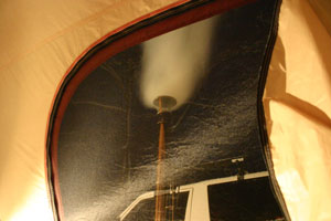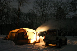 すでに暗くなった午後5時過ぎ、最後の荷物を積んで三度古山へ。いよいよ薪ストーブの設置を開始。ところがここで問題が・・・。テントを張った場所が芝生の際ぎりぎりだったため、煙突の支えとして打つ予定だったパイルドライバー(ランタンスタンド)の打つ場所の下はアスファルト。う〜ん、今から雪かきしてテントの位置をずらす訳にもいかず色々工夫した結果、ストーブ設営完了。薪に火がついて煙突から煙が出てくると、なんだかうれしい気分になった。