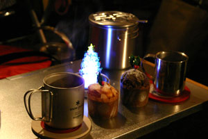 テントから見える煙突の煙はいいねえ。デザートもちょっぴりクリスマスの雰囲気で。