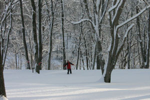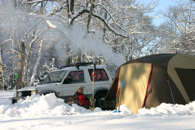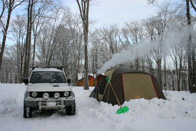 午前中に、ホームセンターで薪ストーブ設置のための色々なパーツを購入してテントと雪かき道具だけ持ってまずは現地へ急ぐ。前日の夜から降り続いた雪は20センチ以上積もっていてキャンプ場入り口は、道路除雪の雪が小山になっている。おお〜、まずは入り口の雪かきからやるのか〜と覚悟を決めた姫だったが、kenjiはパジェロをバックでぐいぐいと入っていって雪を踏み固めてしまった。こうなればあとはテントサイトまで、ぶい〜んと雪を踏み固めていくだけ。まだ積雪は40センチくらいのもので、思ったより難儀しなかった。