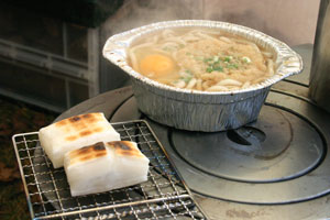 お昼は餅入り鍋焼きうどん。やっぱりストーブで焼いた餅はうまい!