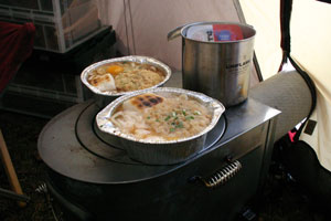 炊事場は使えないので、野菜は全部切って、ご飯は炊きたてを持参。こんなことができるのも家から車で10分のキャンプ場ならではのことだ。