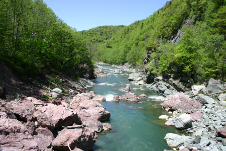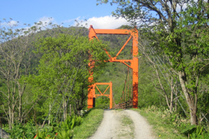せっかくなので、車で少し移動して赤岩青巌峡へ行ってみる事にした。ダート道をしばらく行くと、赤い橋があって、その下は赤い岩がごろごろ。ここは、一億年前海底だった頃の活火山の影響で出来た赤い岩と青い岩がごろごろしている景勝地だ。