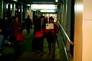無事到着 ママさん荷物を持って出口へ急ぐ お迎えのプラカードを持って恥ずかしげもなく歩く姫と一緒でちょっと恥ずかしいママさん