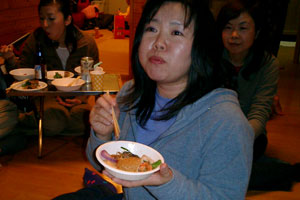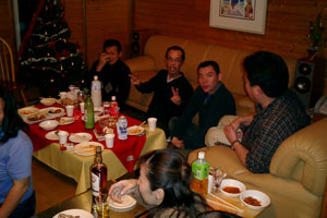 いよいよパーティの日 天気予報では暴風雪のはずが割とおだやかな朝を迎えて、みなさんをお迎えする最終準備にかかる。 ゲストの皆さんには、自分の飲み物を持参していただく事と、一品持ち寄り歓迎でご案内したところどうやら事前の情報でもすごいご馳走になりそうだということが判明したので、姫が作る料理は数品。 中味はmo-chanママさんが載せてくれているので省略。 お品書きは、キムパプ(韓国海苔巻き)、チャプチェ(韓国の五目炒め和え)、子供向けに大きなハンバーグツリー飾り、それに定番のmoonさんのレシピによるミネストローネ。 みなさんからの料理を並べると大変豪華になりました。ぜんぶ食べきれる〜??