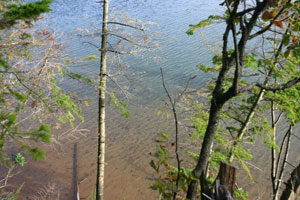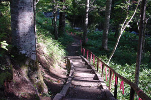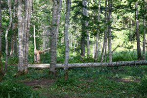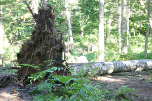 気を取り直して、然別湖の周りを散策。湖面は静かに輝いているけれど、森の中はまだ昨日の台風がそのまま残っているようだ。