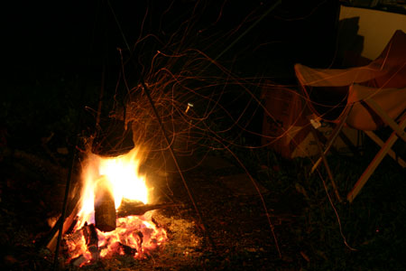 夕暮れになってきて、ファイアーサークルで焚き火。そこいら中に落ちている枝を拾ってきてキャンプ場の掃除。