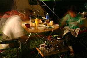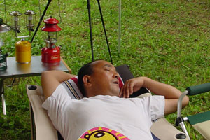 設営を終えてしばしのんびり。kenjiは、かわいいお道具をいじくっている。 そろそろお腹空いたよ〜。(姫)