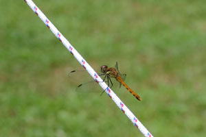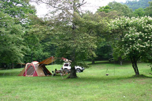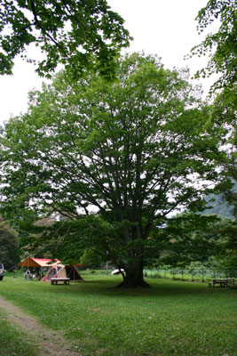 場内は、広葉樹がたくさん。それぞれの木に樹木の名前のプレートがつけられている。いろいろ考えたあげくkenjiの気に入った木のそばに設営。ところが・・・・、タープを張っているときからアブがたくさん寄ってくる。ありゃりゃ〜、こりゃやばいかも?