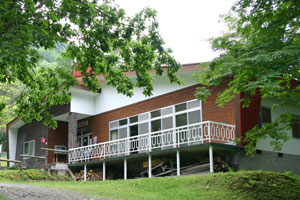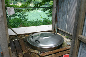 右上の蓋ついた銀色の物体は、給食用の大鍋。灯油タンクに水を入れて沸かしたのをホースで鍋に入れてお風呂にするというアイディアもの。この時は、灯油タンクの位置を調整中でした。kenjiは、管理棟からの静内湖を写真に撮ったり、管理人さん手作りの風呂の話を聞いたりしたあと、口あけて昼寝。これを楽しみにキャンプに来ているらしい。