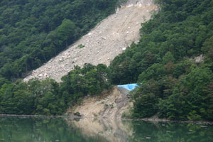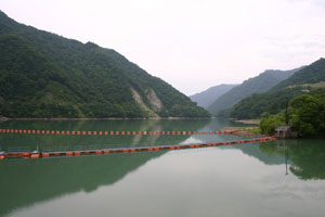 キャンプ場へはどんどん奥へ入っていって、最後はダート道。細い道の両側はうっそうと木が生茂っていていかにもkenji好み。(写真は静内ダムの上を通過するところ・・ここから更に奥に進む。)