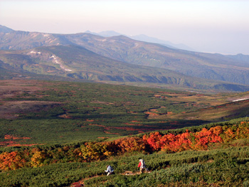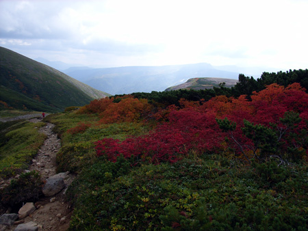 1ヶ月前、お鉢を回って北海岳に到着した時に、ず〜っと続く白雲岳への道は、遥か遠い先に見えたはずなのに、今回はあっという間に着いてしまった。北海岳から眺めるお鉢の中は秋が進んでいた。