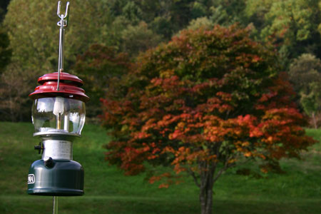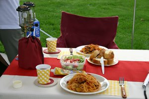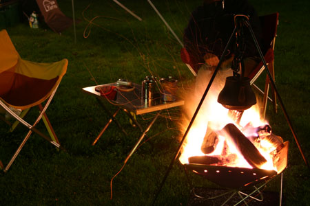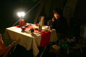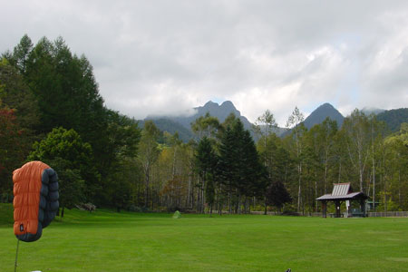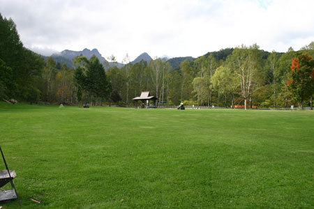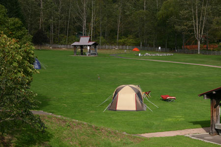 出発がいつもより少し早かったため、到着したときにはまだ明るかった。初めてのキャンプ場は暗いとちょっと不安。目の前には緑の芝生が広がっていてサイトの先客はソロが2組。まず全体を偵察しに行ったkenjiが戻ってきた。第一サイトには数組のテントがあるらしい。じゃ、こっちの広いほうにしようと、ふかふかに刈り揃えられた芝生の真ん中に設営した。