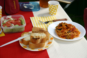 ランチはフランスパンとなすのトマトソースパスタでおなかいっぱい。